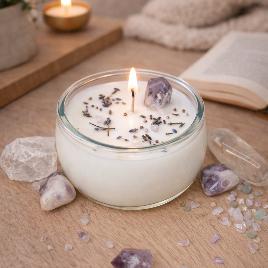 Svíčka pro čistý prostor, jasnou hlavu a klidný dech. Ametyst utišuje mysl, křišťál podporuje harmonii. Ideální při práci, meditaci i večerní relaxaci.