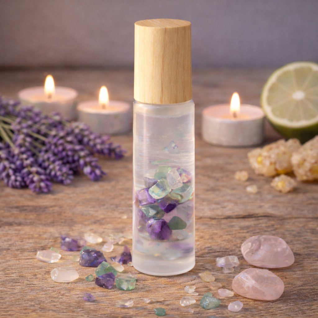 Frakcionovaný kokosový olej, esenciální oleje levandule, bergamot, kadidlo, drobné krystaly fluoritu a křišťálu.